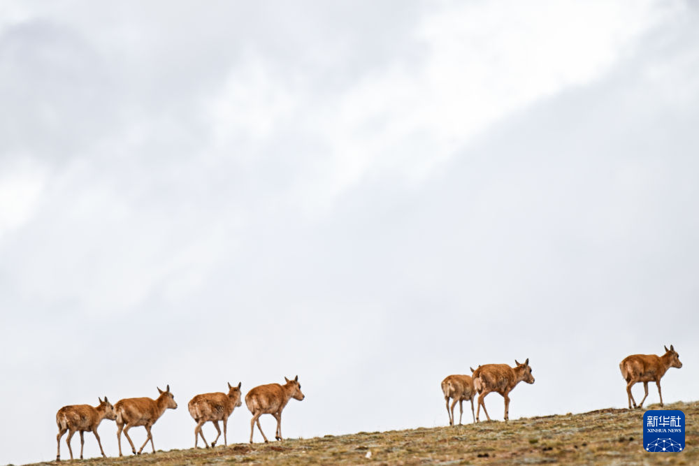 2024年5月27日,藏羚羊在可可西裏五道梁地區遷徙。新華社記者 張龍 攝