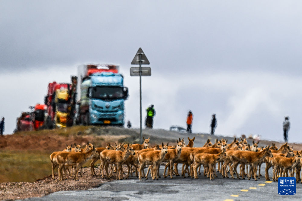 2024年5月27日,藏羚羊在可可西裏五道梁地區通過青藏公路。新華社記者 張龍 攝