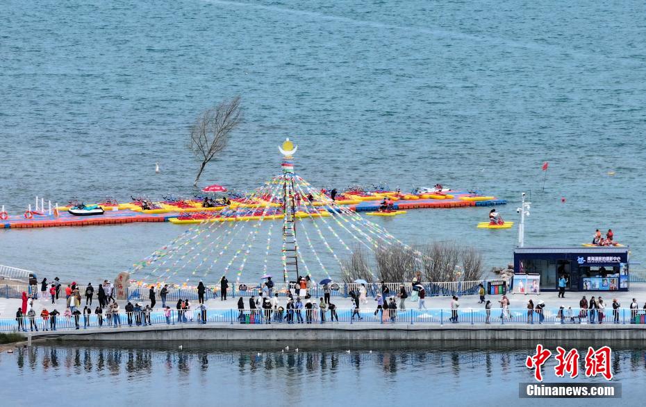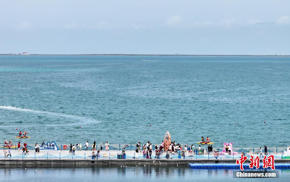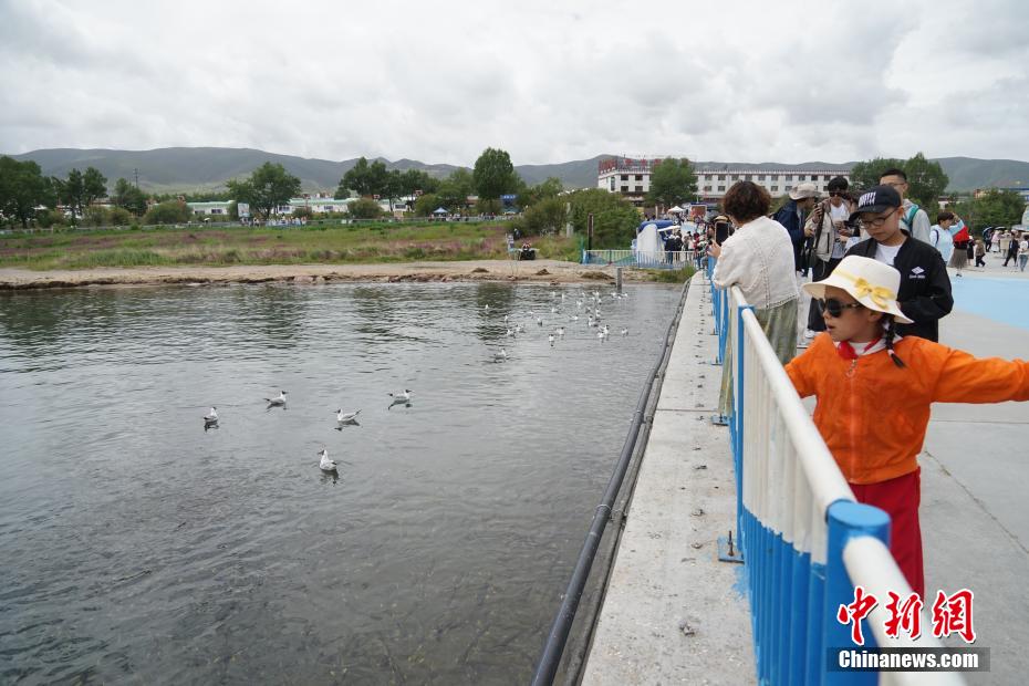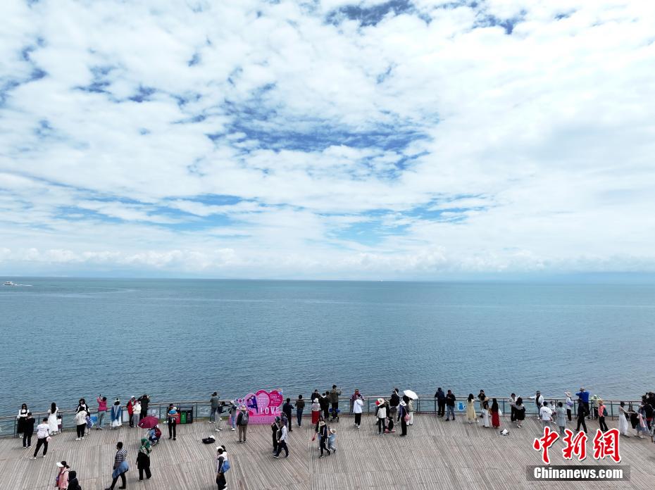 7月8日,遊客在青海省海南藏族自治州共和縣青海湖二郎劍景區內(nei) 觀賞“魚鳥共生”的生態景象。中新社記者 馬銘言 攝