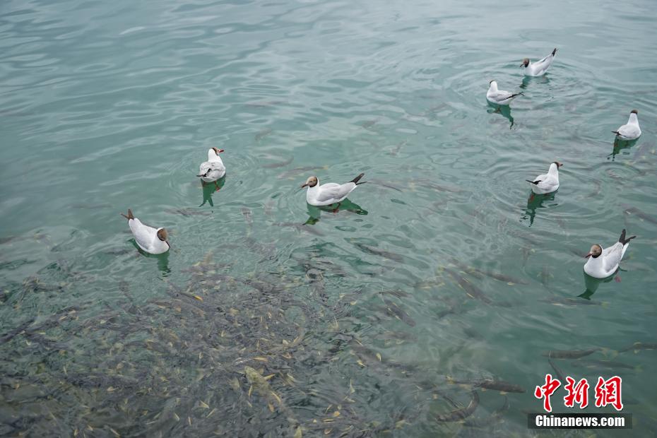 7月8日,青海省海南藏族自治州共和縣青海湖二郎劍景區內(nei) ,“魚鳥共生”的生態景象。中新社記者 馬銘言 攝