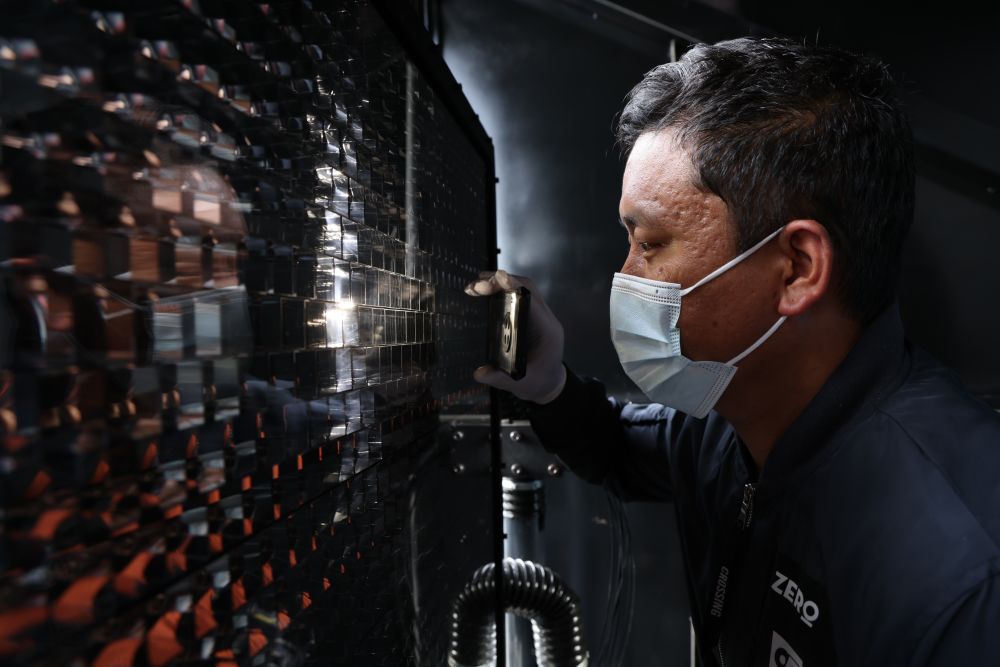 2023年4月21日,工作人員在水切倫(lun) 科夫探測器陣列三號水池裏更換實驗設備。新華社記者 金立旺 攝