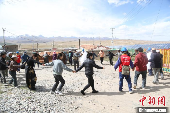 圖為(wei) 通電後,牧民群眾(zhong) 與(yu) 工程建設者興(xing) 高采烈地在配電台區前載歌載舞。許小萍 攝