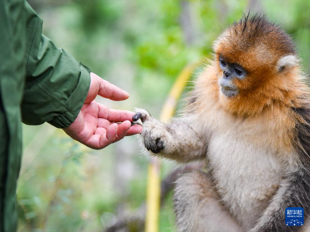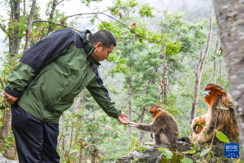 在四川白河國家級自然保護區,唐玉林和川金絲(si) 猴互動(10月11日攝)。新華社記者 王曦 攝