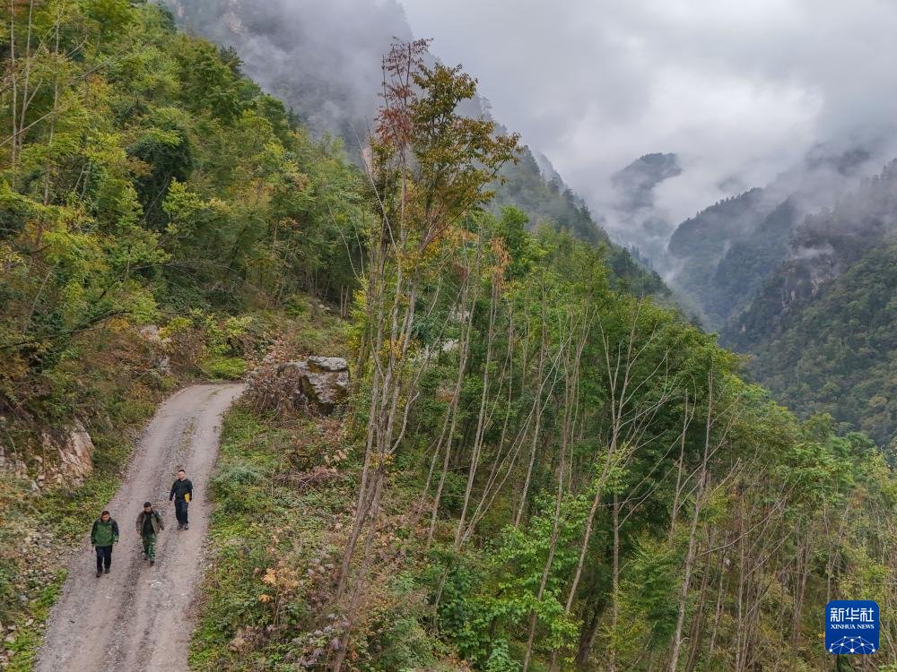 在四川白河國家級自然保護區,唐玉林(左)、侄子唐小剛(中)和西華師範大學生物學研究生劉昕走在巡護的路上(10月11日攝)。新華社記者 王曦 攝