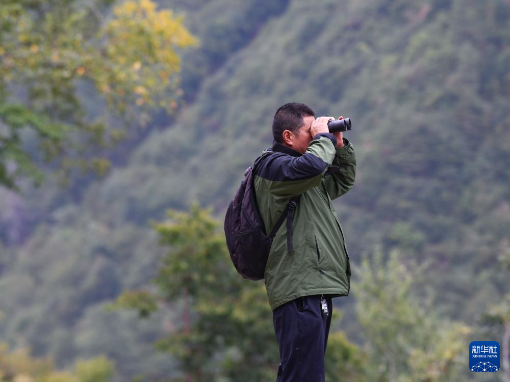 在四川白河國家級自然保護區,唐玉林在觀察川金絲(si) 猴活動(10月11日攝)。新華社記者 王曦 攝