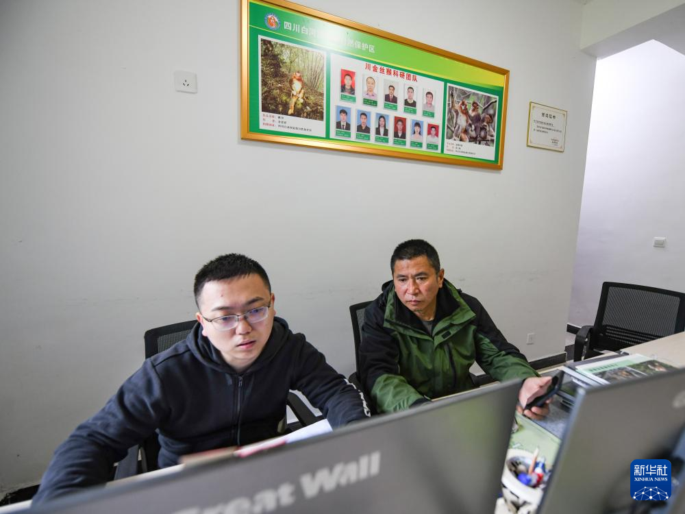 在四川白河國家級自然保護區,唐玉林和西華師範大學生物學研究生劉昕在辦公室將巡護記錄的資料錄入電腦係統(10月11日攝)。新華社記者 王曦 攝