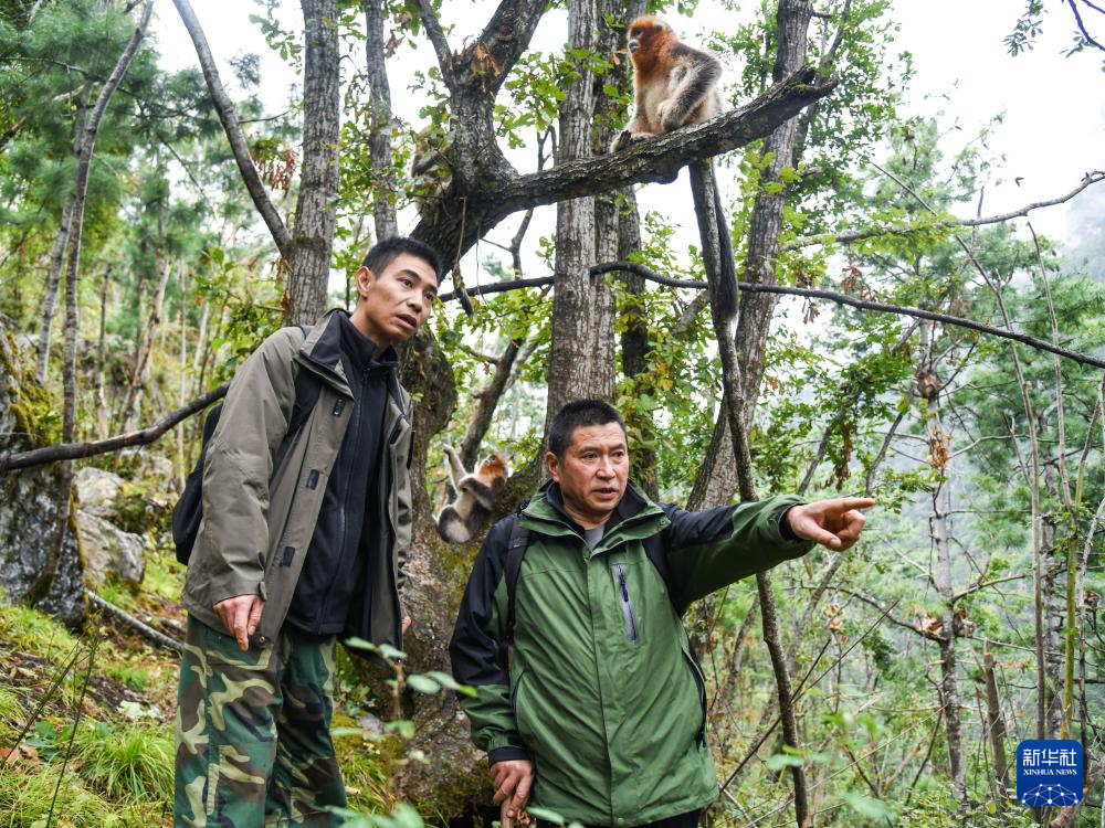 在四川白河國家級自然保護區,唐玉林(右)向侄子唐小剛介紹川金絲(si) 猴的生活習(xi) 性(10月11日攝)。新華社記者 王曦 攝