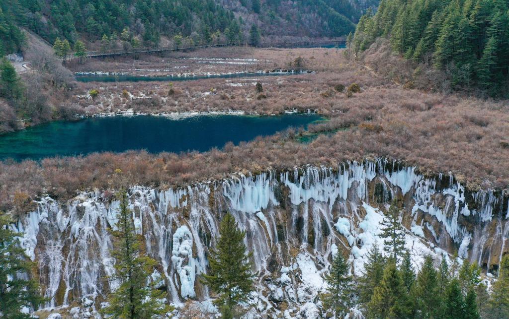 這是冬季在九寨溝景區拍攝的諾日朗瀑布形成的冰瀑景觀。新華社記者 王曦 攝