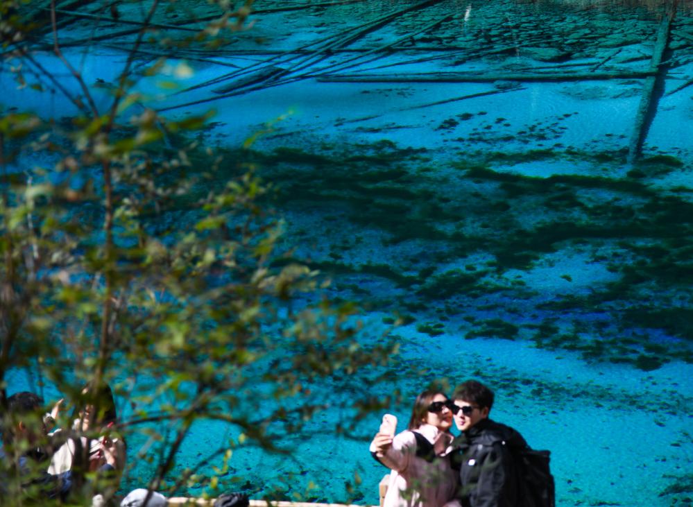 遊客在九寨溝景區觀光留影。新華社記者 王曦 攝