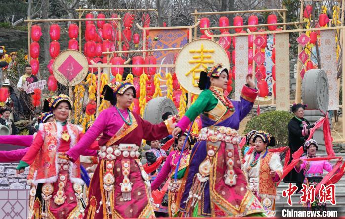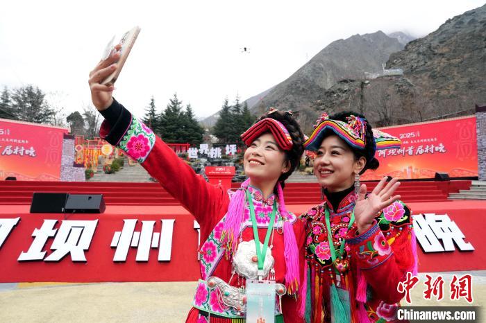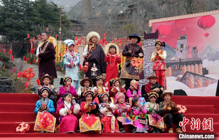 1月25日,四川理縣,當地民眾(zhong) 著民族服飾在村晚現場合影留念。中新社記者 安源 攝