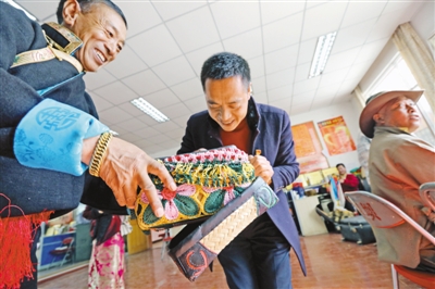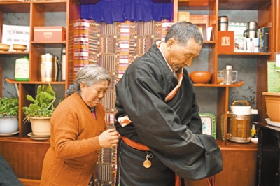 次仁曲宗老阿媽(左)幫助丈夫達仁多吉穿上新藏裝。