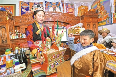 大年初一,各族群眾(zhong) 穿上漂亮的新衣,互致新春的問候。在每個(ge) 家庭中,奶渣、風幹牛肉、人參果飯、各色糖果、飲料、啤酒、青稞酒等擺滿了客廳的桌子,長者們(men) 手捧吉祥的切瑪盒,端著青稞酒給家裏的親(qin) 朋好友送上誠摯的祝福。吉祥的切瑪盒裏裝著青稞、糌粑等,插上五彩麥穗和羅薩美朵,象征著來年風調雨順、五穀豐(feng) 登、吉祥如意。