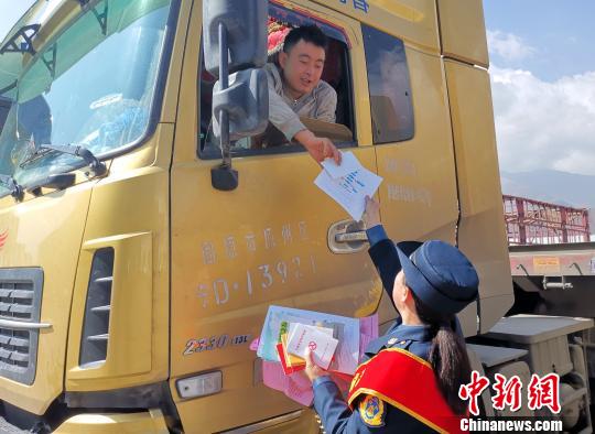 圖為(wei) 西藏自治區路政管理局工作人員向貨車司機發放宣傳(chuan) 資料。趙延 攝