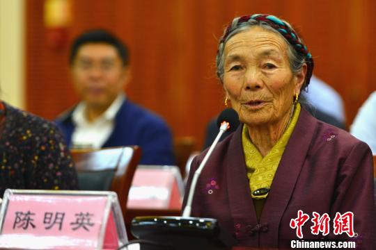 原十八軍(jun) 戰士陳明英講述西藏變化。 江飛波 攝