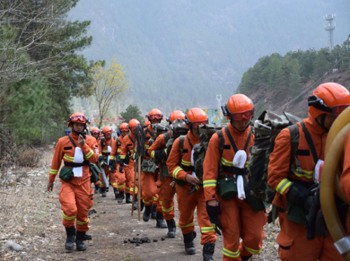 隊員們(men) 喜歡把滅火稱為(wei) “打火”。雖然現在是和平年代,但“打火”對他們(men) 來說就是戰爭(zheng) 。他們(men) 手裏雖然不拿步槍、機槍,但是拿著打火用的水槍。拿著它上火場,那感覺跟上戰場打仗差不了多少。剛下隊的新隊員,第一次打火往往會(hui) 很興(xing) 奮,坐上去火場的車,他們(men) 會(hui) 說個(ge) 不停。老隊員們(men) 則明白,車一旦開出營區,啥時候能回來,運氣很重要。這時候,老隊員們(men) 都會(hui) 閉上眼睛不說話,為(wei) 即將到來的戰鬥儲(chu) 存體(ti) 能。察隅山高坡陡、穀深林密。當山林起火時,汽車隻能把他們(men) 送到距離火場最近的公路切入點。而剩下的路,需要他們(men) 徒步走完。攜帶的打火工具和給養(yang) ,讓每個(ge) 人的負重少則四、五十斤,多則六、七十斤。2015年“5.12”上察隅鎮那場大火,不到十公裏的山路,隊員們(men) 整整走了14個(ge) 小時才到達火場。那是一片原始林區,沒有人去過,自然也就沒有路。密集的林子,張牙舞爪的荊棘,幾乎沒有給人留下通過的空間,所有的路都要隊員們(men) 自己拿著砍刀和油鋸開出來。走到夜裏,困意和疲憊會(hui) 侵蝕每個(ge) 人的身體(ti) ,思考的能力和興(xing) 奮的感覺消失殆盡,隻剩下機械式行走的軀體(ti) ,進行著條件反射式的報數,但隊員們(men) 都會(hui) 咬著牙向火線挺進,因為(wei) 上了火場就沒有回頭路,就看誰能硬扛到最後。
