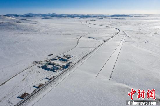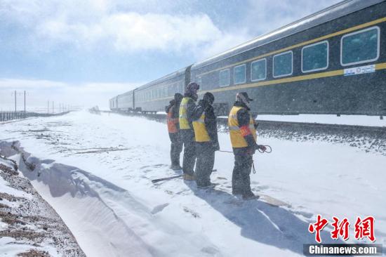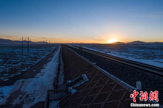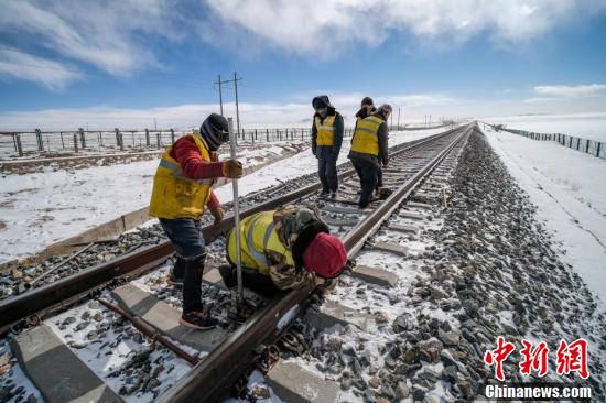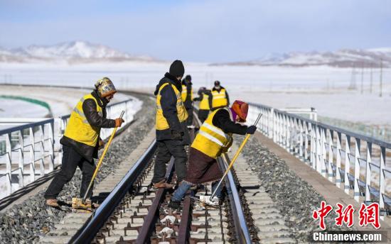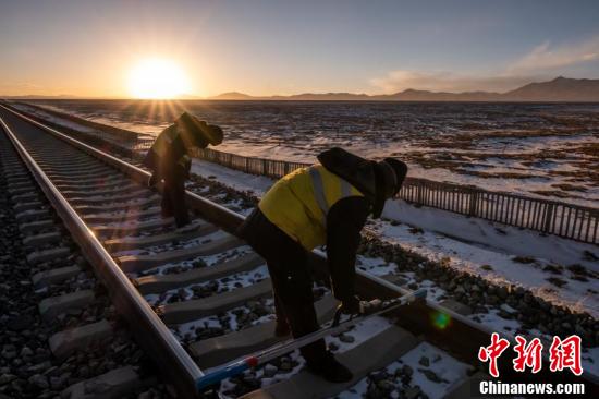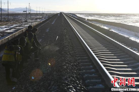 航拍安多車間工作人員檢查軌道設備情況。在這裏堅守的數十名工作人員負責轄區36公裏的青藏鐵路線路維護任務,他們(men) 守護在“生命禁區”的“天路”兩(liang) 旁,保障每一列穿行於(yu) “世界屋脊”的列車安全運行。(中新社記者 何蓬磊 攝)