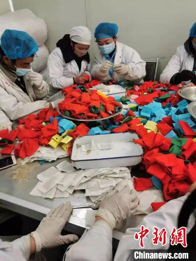 圖為(wei) 近日,山南市藏醫醫院製作了藏藥防疫散香囊2000包,捐贈給武漢。 山南市委宣傳(chuan) 部 供圖 攝
