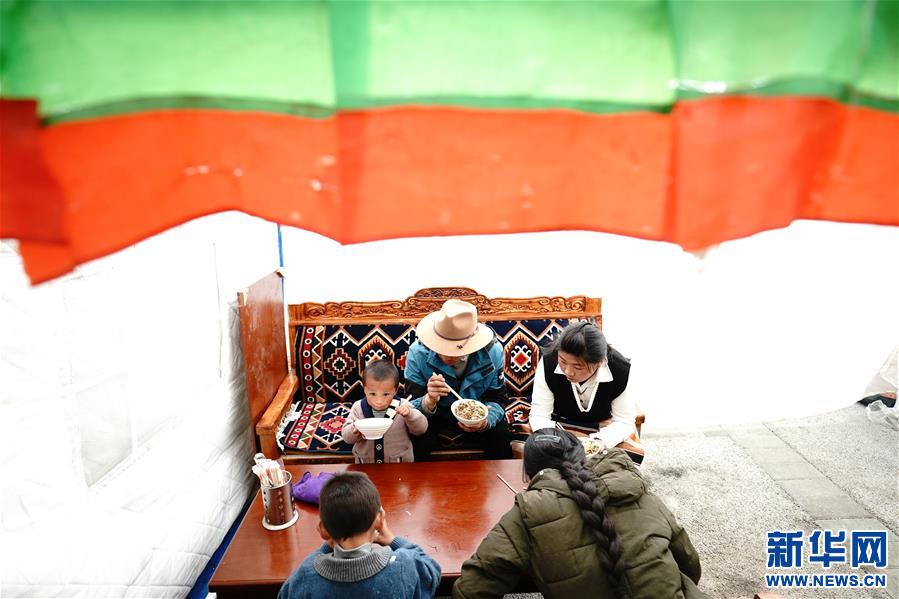 在森布日極高海拔地區生態搬遷安置點,格多一家人在帳篷甜茶館裏吃飯(4月15日攝)。新華社記者 詹彥 攝