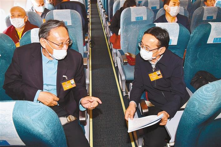 5月20日,全國政協委員、西藏人民醫院副院長格桑羅布(左)與(yu) 全國政協委員、西藏大學科研處處長圖登克珠在前往北京途中就如何在全國兩(liang) 會(hui) 上建言獻策、履職盡責進行交流。記者 旦增西旦 攝
