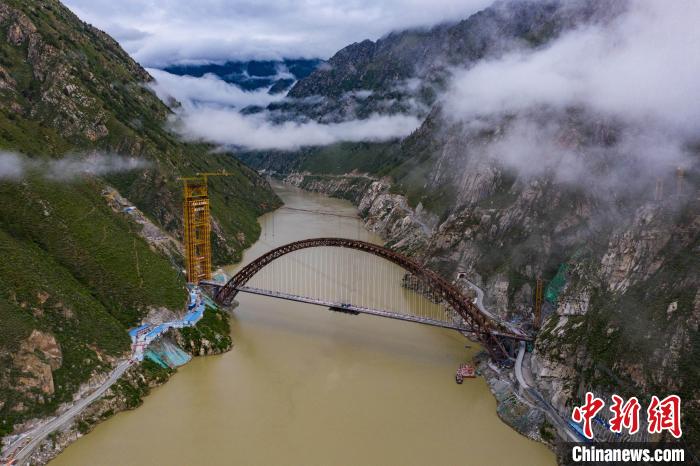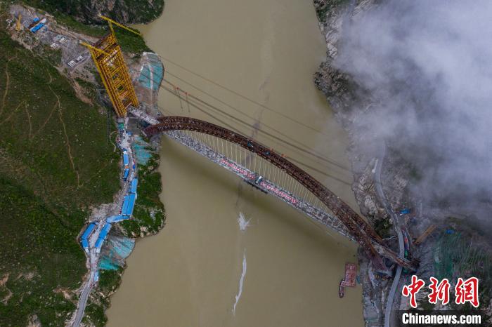 6月20日上午7時許,川藏鐵路拉薩至林芝段重點標誌性工程藏木雅魯藏布江雙線特大橋主梁成功合龍。何蓬磊 攝