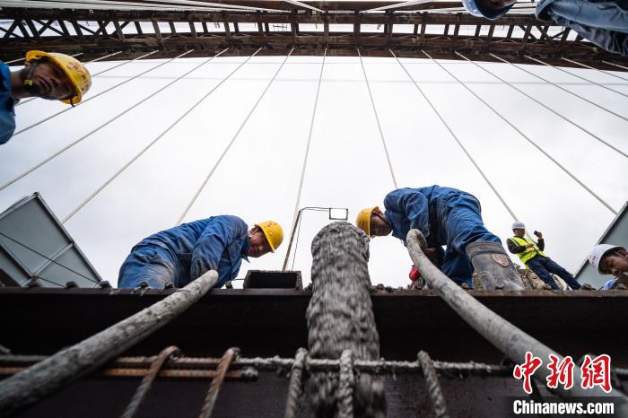 圖為(wei) 6月20日,中鐵廣州工程局工人在藏木特大橋進行合龍作業(ye) 。何蓬磊 攝