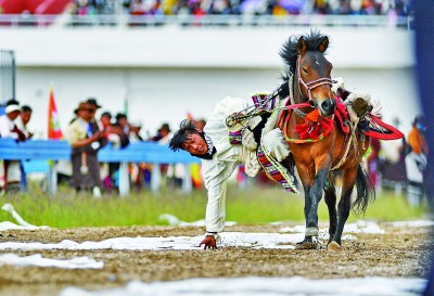 8月10日,2020年那曲羌塘恰青格薩爾賽馬藝術節在西藏那曲市格薩爾賽馬場開幕。圖為(wei) 騎手在藝術節開幕式上表演騎馬撿哈達。新華社記者 張汝鋒 攝