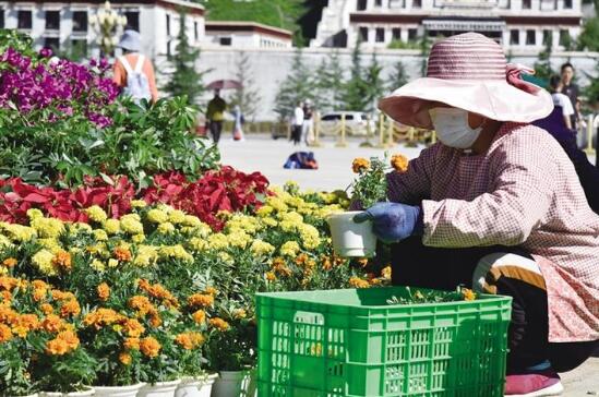 走在拉薩街頭,大家可能已經感受到雪頓節濃厚的節日氣氛。布達拉宮廣場的立體(ti) 花雕吸引人們(men) 拿出手機拍照留念。為(wei) 了迎合今年雪頓節的主題,立體(ti) 花雕上有“歡樂(le) 雪頓、健康拉薩”幾個(ge) 大字,花雕中央是今年雪頓節的LOGO。整個(ge) 花雕用紅黃兩(liang) 種顏色的塑料花製作,顏色非常鮮豔亮麗(li) 。花雕下麵用萬(wan) 壽菊、一品紅等花卉綠植來襯托,烘托出歡樂(le) 喜慶的節日氛圍。