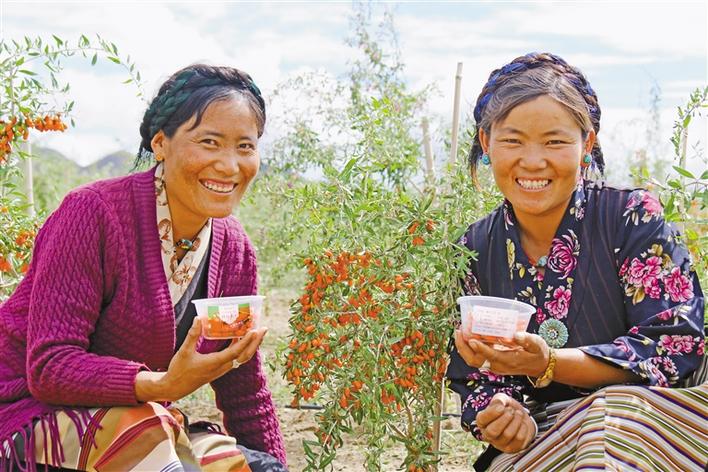 圖為(wei) 當地群眾(zhong) 正在展示在日喀則市白朗縣嘎東(dong) 鎮枸杞產(chan) 業(ye) 園區配套水保綜合項目內(nei) 收獲的枸杞。