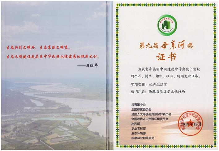 圖為(wei) 西藏自治區水土保持局獲得“第九屆母親(qin) 河優(you) 秀組織獎”獲獎證書(shu) 。