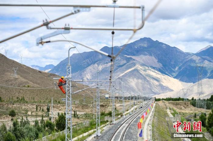 資料圖:川藏鐵路拉薩至林芝段接觸網專(zhuan) 業(ye) 首件工程在西藏山南市紮囊至紮其區間成功建成。 中新社記者 何蓬磊 攝