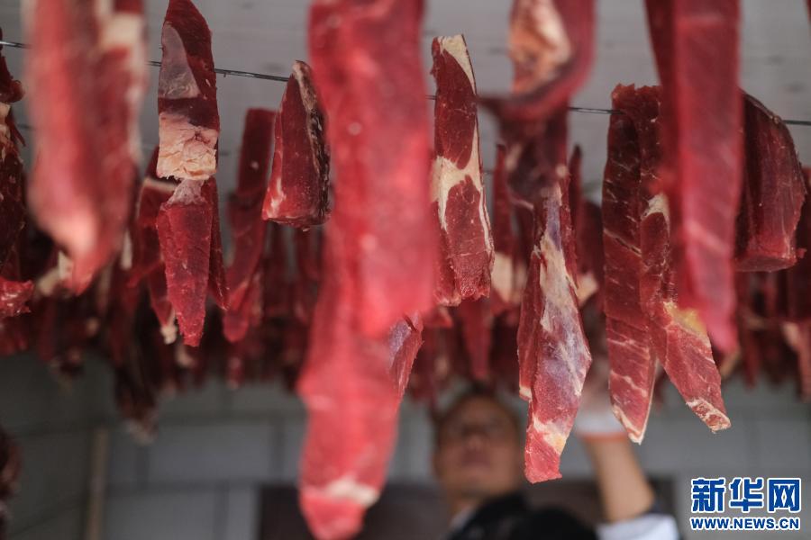 2021年1月2日,在拉薩一民居內(nei) ,藏族群眾(zhong) 將切好的犛牛肉懸掛在通風處,製作風幹肉。新華社記者 晉美多吉 攝