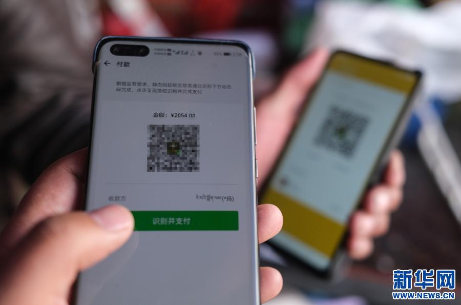 顧客用微信支付剛買(mai) 的牛羊肉款(2020年12月31日攝)。新華社記者 晉美多吉 攝