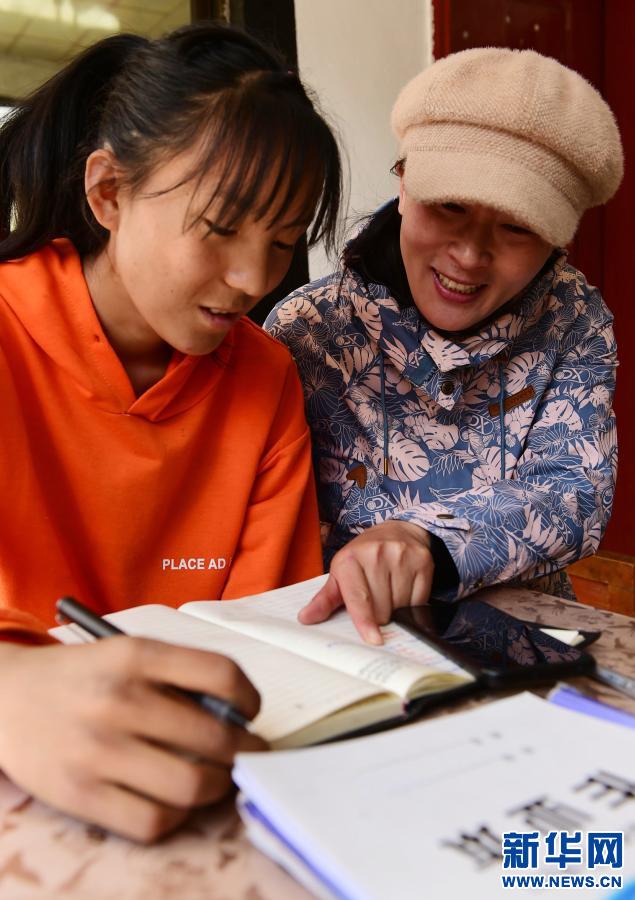 2020年3月26日,在西藏林芝市朗縣紮西塘村的一戶建檔立卡貧困戶家中,西藏林芝市委宣傳(chuan) 部駐村工作隊員何曉雪(右)正在為(wei) 學生輔導功課。 新華社發(索朗羅布 攝)