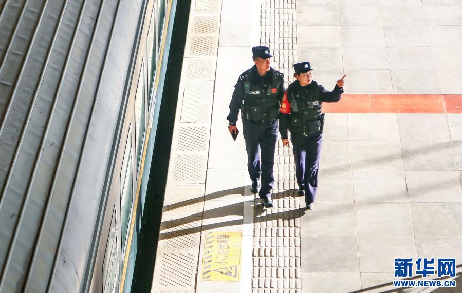 1月10日,“女子格桑花”警組民警雷穎君(右)與(yu) 同事在火車站裏巡邏。新華社發(胡安鵬、黃飛攝影報道)
