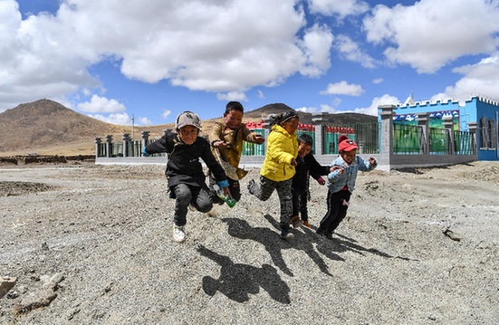 在我國海拔最高的行政鄉(xiang) ——西藏山南市浪卡子縣普瑪江塘鄉(xiang) ,小朋友們(men) 在新建成的幼兒(er) 園前玩耍。記者 晉美多吉 攝