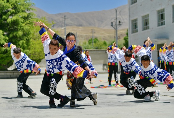 在西藏山南市第一高級中學,來自湖北省武漢市旅遊學校的援藏教師馬丹(左三)指導學生練習(xi) 校園啦啦操。記者 張汝鋒 攝