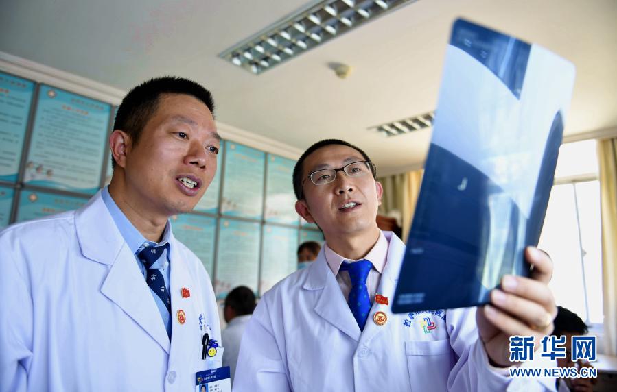 2017年8月3日,在拉薩市人民醫院骨科病房,北京積水潭醫院的援藏醫生龔曉峰(右)和北京天壇醫院援藏醫生李家謀查看患者的X光片。新華社記者 晉美多吉 攝