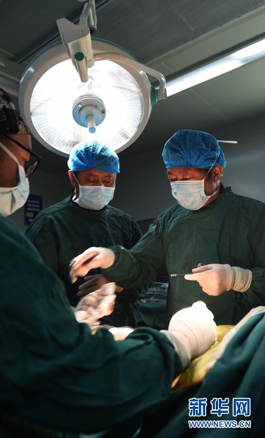 2017年5月26日,援藏醫生李家謀(右)帶領拉薩市人民醫院的藏族醫生進行微創脊柱手術。新華社記者 覺果 攝