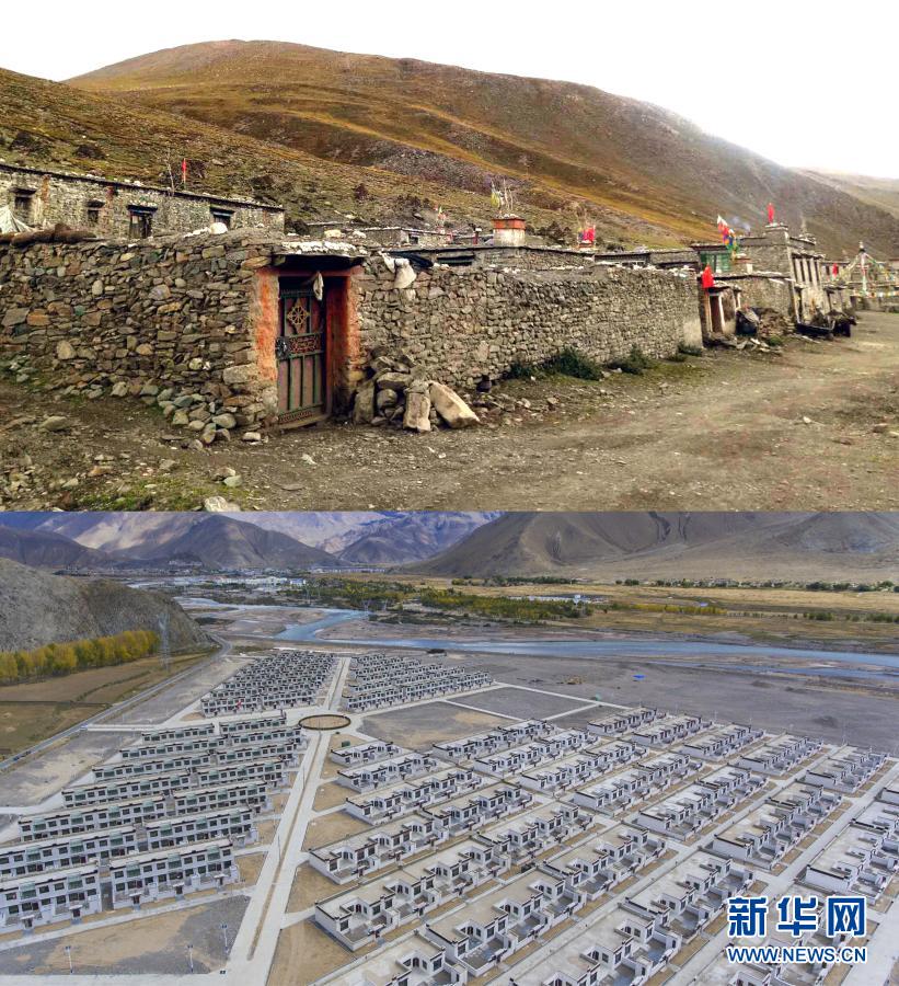 拚版照片:上圖是曾經的西藏日喀則市拉孜縣查務鄉(xiang) 民房(資料照片);下圖是西藏日喀則市南木林縣孔阿村易地搬遷點(2018年9月28日南木加攝,無人機照片 )新華社發