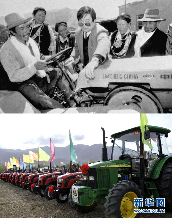 拚版照片:上圖是1996年,山東(dong) 省援助西藏的首批農(nong) 機物資日前抵達日喀則。圖為(wei) 山東(dong) 援藏幹部在給當地藏族農(nong) 民講解農(nong) 機具的使用方法(新華社記者 土登 攝);下圖是2012年5月4日,西藏日喀則市白朗縣成為(wei) 西藏自治區第一個(ge) 農(nong) 業(ye) 機械化示範縣。圖為(wei) 停放在白朗縣田間的農(nong) 業(ye) 機械(新華社記者 多吉占堆 攝)。新華社發