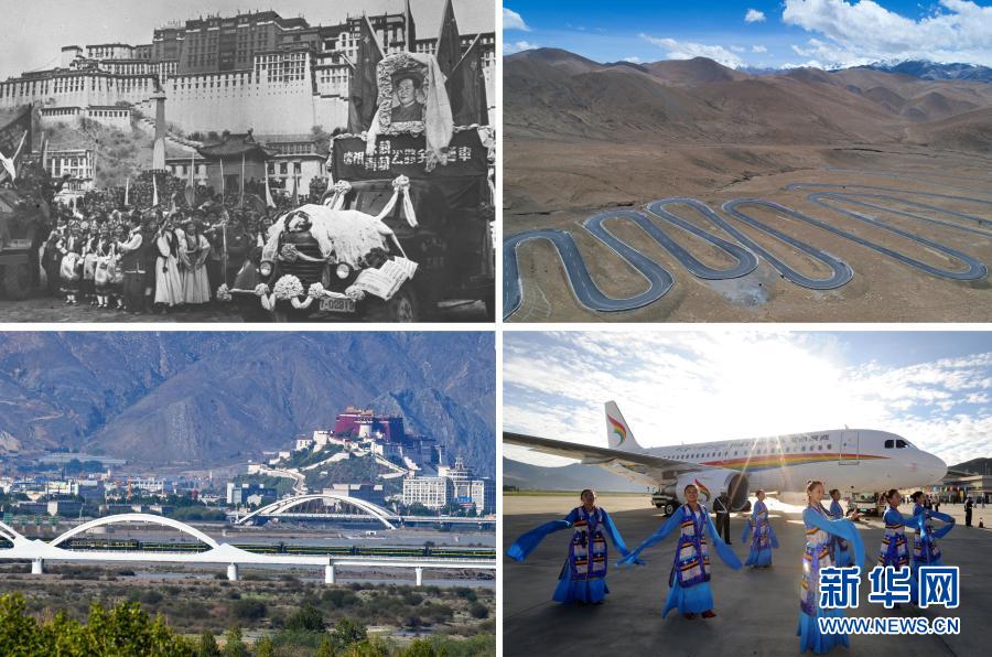 拚版照片:左上是1954年12月25日,康藏(今川藏)、青藏兩(liang) 條公路勝利通車到拉薩。圖為(wei) 在布達拉宮前舉(ju) 行的盛大通車儀(yi) 式(資料照片);左下是青藏鐵路列車抵達拉薩(2016年6月27日新華社記者普布紮西 攝);右上是通往珠峰的公路(2017年5月19日新華社記者普布紮西 攝)右下是西藏航空有限公司正式通航(2011年7月26日新華社記者 覺果攝)新華社發
