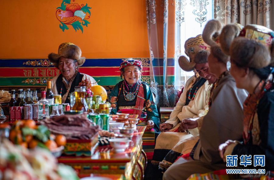 1月14日,在位於(yu) 嘎吉林村安置點的新家中,村民們(men) 身著盛裝共度日喀則藏曆農(nong) 家新年。新華社記者 孫非 攝