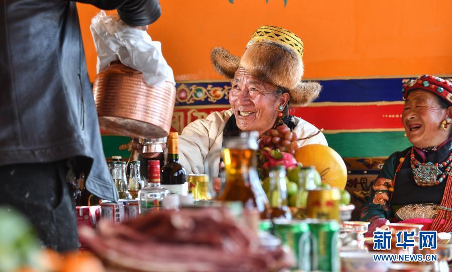 1月14日,在位於(yu) 嘎吉林村安置點的新家中,村民在給長輩敬酒。新華社記者 孫非 攝