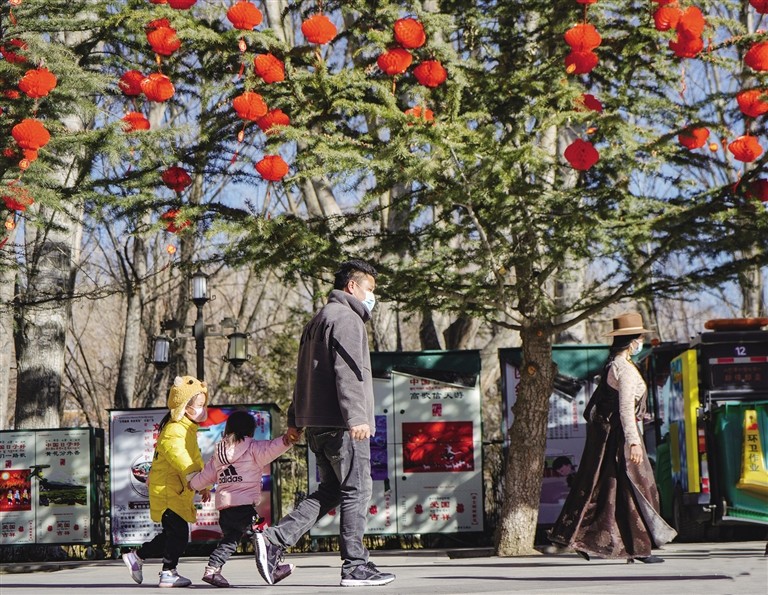 結束晨練的邊珍正在給紅燈籠下一蹦一跳玩耍的孫女拍照,“到處都掛滿了紅燈籠,把公園裝扮得格外喜慶,很有節日的氣息。”邊珍說。