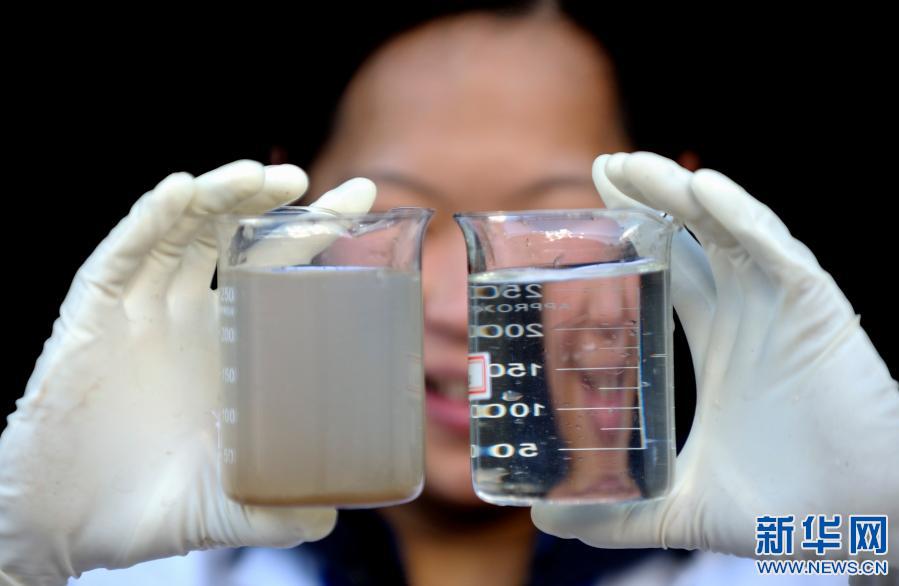 在西藏昌都汙水處理廠,一名工作人員在展示汙水處理結果(2010年10月6日攝)。新華社記者 普布紮西 攝