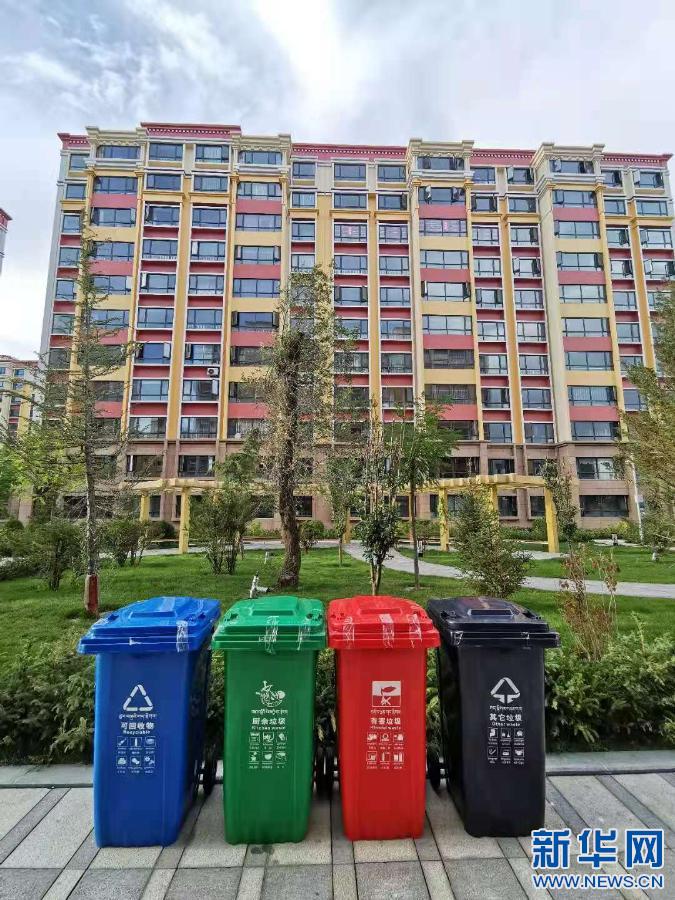 拉薩一新建成小區內(nei) 擺放的垃圾分類回收桶(2020年9月6日攝)。新華社記者 普布紮西 攝