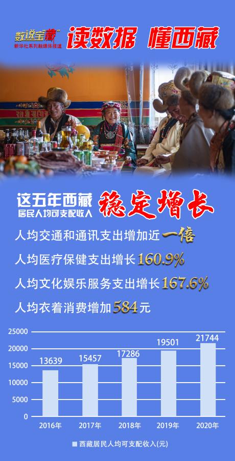 “十三五”期間,在中央和地方一係列政策措施的推動下,西藏居民收入持續攀升。西藏自治區政府統計數據顯示,2020年西藏居民人均可支配收入達21744元,較2015年增長77.4%。