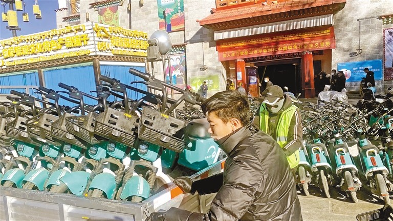 “叮……歡迎使用共享電動車,請在運營區內(nei) 騎行,請慢點,注意安全。”共享電動車在拉薩市的落地投放,有利於(yu) 緩解市民停車難、出行難壓力,助力城市智慧交通建設。在拉薩萬(wan) 達廣場門口,工作人員正將共享電動車擺放整齊,並用酒精擦拭消毒。
