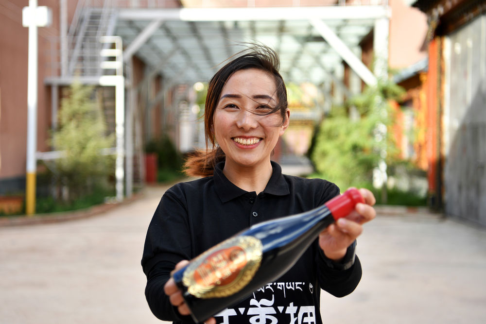 西藏芒康縣藏東(dong) 珍寶酒業(ye) 有限公司副總經理曲措在展示一款“達美擁”葡萄酒(2020年5月4日攝)。新華社記者 詹彥 攝