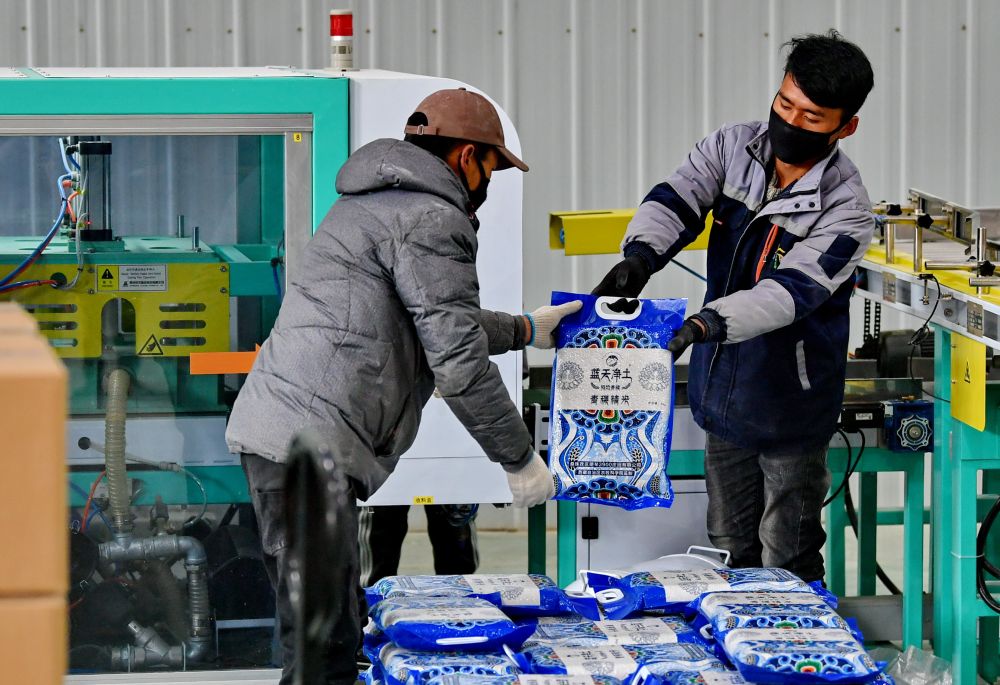 在日喀則德琴3900莊園有限公司,企業(ye) 員工索朗平措(左)和倫(lun) 珠加措擺放袋裝青稞米(2020年3月6日攝)。新華社記者 張汝鋒 攝